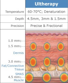 ウルセラは、焦点式超音波を4.5㎜(SMASと呼ばれる筋膜)と3㎜(皮下組織)に照射し、顔のたるみのリフトアップを行います。