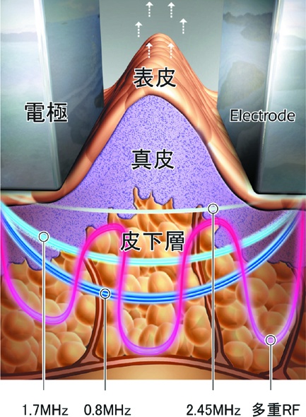 - 吸引型高周波(マルチチャンネル)→予熱モードで、3つの周波数をすべて同時に照射し、皮下組織の深い所から浅いところまで均一に熱を加えます。