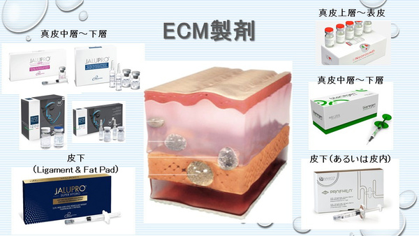 各ECM製剤は、ターゲットにする深さが異なります。大きく分けて、真皮上層、真皮中層から下層、皮下です。また製剤より得られる効果は異なり、肌質改善、肌のハリ、引き締め、ボリュームアップと様々です。